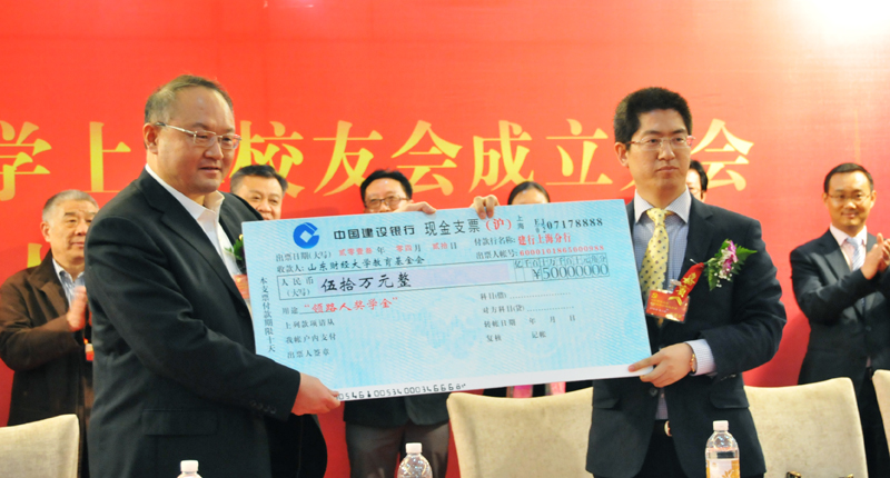 2012420,在山东财经大学上海校友会成立之际,2001级校友上海领路人照明工程有限公司朱上民董事长为母校捐助50万元设立“领路人奖学金”,助力学校发展建设。校长刘兴云、资深校友中国建设银行上海分行行长王江以及学校党委办公室、校友办公室、山东财政职工大学负责同志、上海校友会会长郭晓天、上海领路人照明工程有限公司部分高管等与260名校友出席了捐赠仪式。校长刘兴云代表学校接受捐款,并为朱上民校友颁发捐赠证书。