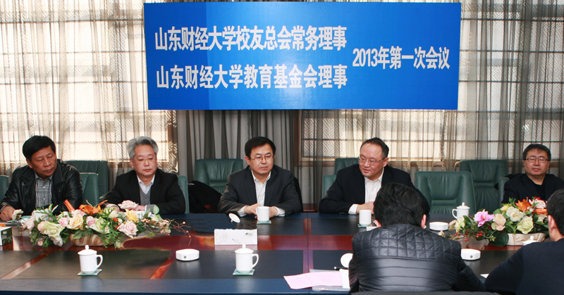 1月13日上午,山东财经大学校友总会第一届常务理事暨山东财经大学教育基金会第一届理事2013年第一次会议在舜耕校区举行。党委书记、基金会理事长郝书辰,校长、校友总会会长、基金会副理事长刘兴云,副校长、校友总会副会长、基金会副理事长胡文波,中国轻工业质量认证中心副主任、校友总会副会长吴越申,山东省再担保集团有限公司董事长、校友总会副会长、基金会理事安郁杰,鲁银集团潍坊分公司总经理、校友总会副会长张炳伟,淄博市政府油区工作办公室副主任、校友总会副会长郭元贡等来自北京、上海及省内各地市的20多名校友总会常务理事及基金会理事参加了会议。会议由胡文波主持。